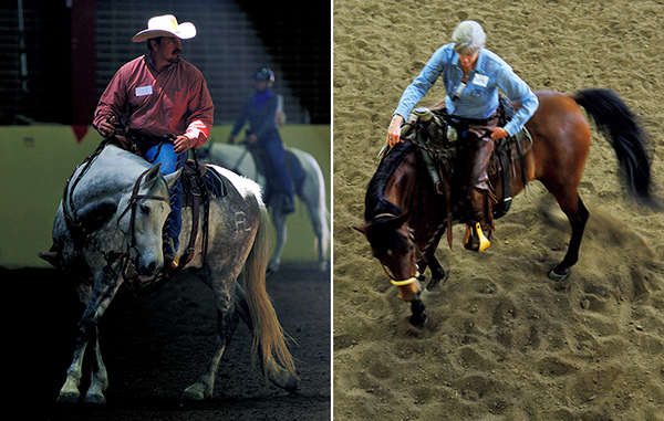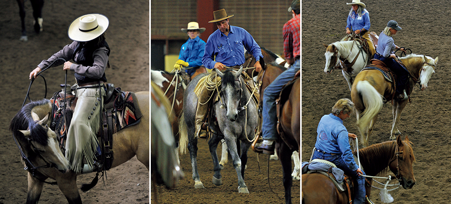 午前のクラスはまずフラッグに馬を慣らすトレーニング。何度も繰り返しながら時間をかけて丁寧に行う。次いで頸を90度に曲げ、そこから輪を描くように歩かせる。これは4日間ずっと続く基礎の基礎であり、左廻り右廻りともスムースな自然の動きができるまで騎乗することはできない。午後のクラスも騎乗ではあるが、まずは輪を描くトレーニングだ。できるだけ小さい輪をルーズレインで作ることを求められる。連日、この動きが続くが、日を追って次第に動きがスムーズになり、観客席からはあたかも人と馬がダンスフロアで舞踏をしているかのようにも見えてくる。