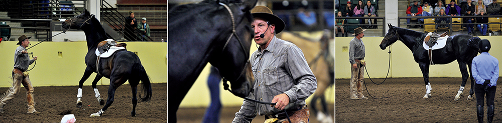 興奮した若馬は手綱を取らせまいともがき、暴れる。息を詰める緊張の時間は5分ほど、いや10分に近かっただろうか。会場全体からホッと嘆息がこぼれた。ついにバックが若馬を手の内に収めたのだ。思いがけずバックの調教シーンを見ることができ、その鮮やかな手腕に胸がすく思いだ。人との信頼関係を築けていないこの馬はバックのアシスタントであるアイザックに預けられオーナーはその後、最後まで傍らについて調教を見ることになる。