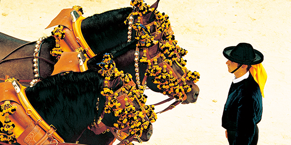 闘牛場の駐車場で観衆に囲まれながら準備運動をするレホネオドール(騎馬闘牛士)と、 豊かなタテガミと尾をそよぐ風に揺らしながら馬祭りの会場を闊歩するアンダルシアン。騎手にはコルドベスという正装が義務づけられている。